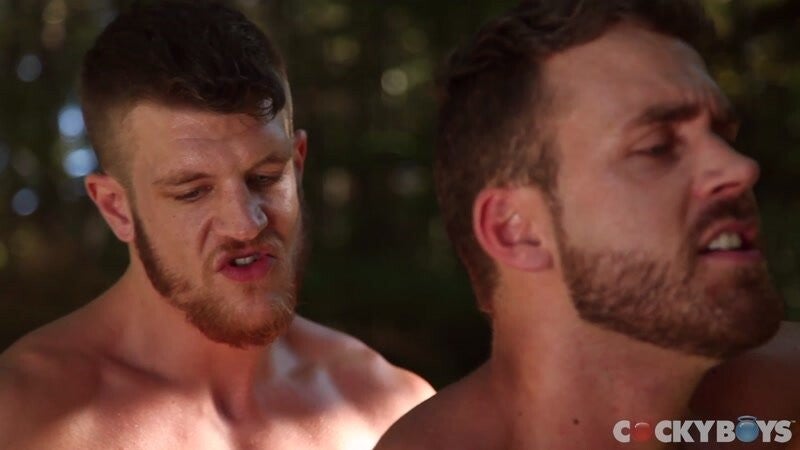With Logan backed against a tree, Caleb positioned his ass comfortably around Logan's thick dick and began pumping. But this only made Logan more aggressive -- he soon gripped Caleb's meaty butt and showed him who was really in charge. Caleb then told Logan to sit on a rock so he could ride him, but just as he was getting close, Caleb flipped the switch and rather abruptly told Logan, "I'm gonna fuck you now." It was like Caleb had the whole thing planned out -- within a matter of minutes, he had Logan bobbing up and down on his cock, then sprawled against the same tree getting rimmed, then getting railed like a jackhammer. In what must have been a dizzy blur for him, Logan quickly shot his load with Caleb still thrusting away. Caleb then flipped Logan around so he could blow a huge cumshot on his pecs! Two hot guys, a beautiful setting, and one hot twist of an ending for sure!