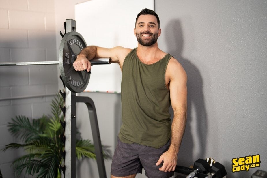 Horny tops Levi and River see hottie Kieran working out, and he takes notice of them, too. The guys strike up a chat and before long they're kissing and undressing in the gym. Kieran sucks River as Levi rims his hole, then eases inside. The tops take turns fucking the bottom till Kieran cums all over Levi's hairy chest as he rides him, and River shoots his load on Levi's chest too for the top to taste as Kieran takes a creampie!