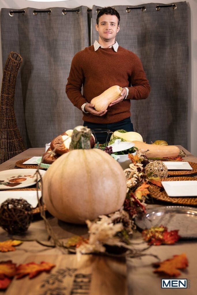 Nate Grimes planned a special Friendsgiving feast, but when his buds cancel at the last minute, he asks his neighbors to share the bounty. Kyle Connors and Kaleb Stryker are excited to be invited, but Jack Hunter is most interested in playing with Nate's prize-winning gourd... and himself, as Nate catches him jacking off in the bathroom before dinner. When the other guys go help Nate with the food, Jack decides to fuck the squash and see if it feels as good as it looks. Kyle and Kaleb find Jack balls-deep in the butternut and get so turned on, they get naked and Kaleb starts sucking Kyle's cock. Nate can't believe his dinner party has turned into a veggie orgy, but Jack encourages him to give the gourd a try. Nate's dick gets super hard fucking the squash, and soon he's joining Kyle and Kaleb and getting fucked in a hot threesome as Jack watches and strokes his cock. Kyle, Nate, and Kaleb give Jack a triple facial before the veggie perv blows a hot load on the sexy squash.
