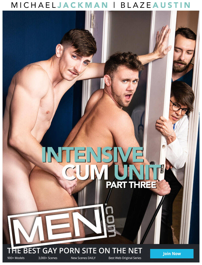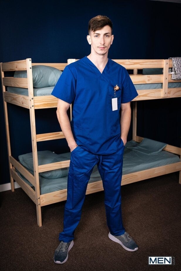 It's been a hard day at the hospital for nurses Michael Jackman and Blaze Austin, and it's only with each other's support that they've made it through. The nurses share a tender moment in the on-call room as they thank each other for being there, then start passionately kissing as things start getting McSteamy! Michael bars the door as he bends Blaze over and pulls down his scrubs to pound him in doggystyle... until a tired doctor tries to come in and catch some winks. Blaze quickly gets into the bottom bunk and Michael hides under the blanket so he can suck Blaze's dick as the doctor is none the wiser. Once the other man is ensconced in the top bunk, Michael fucks the bottom spoon, and the guys even risk some doggystyle before Blaze rides Michael's cock and takes a big facial!