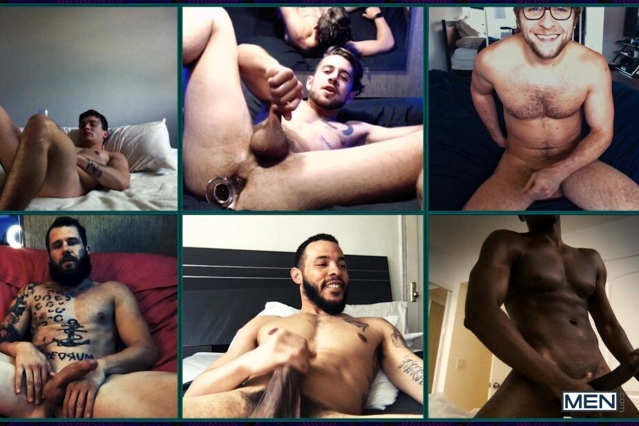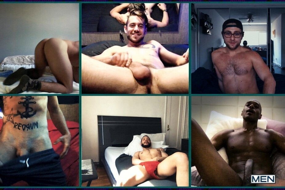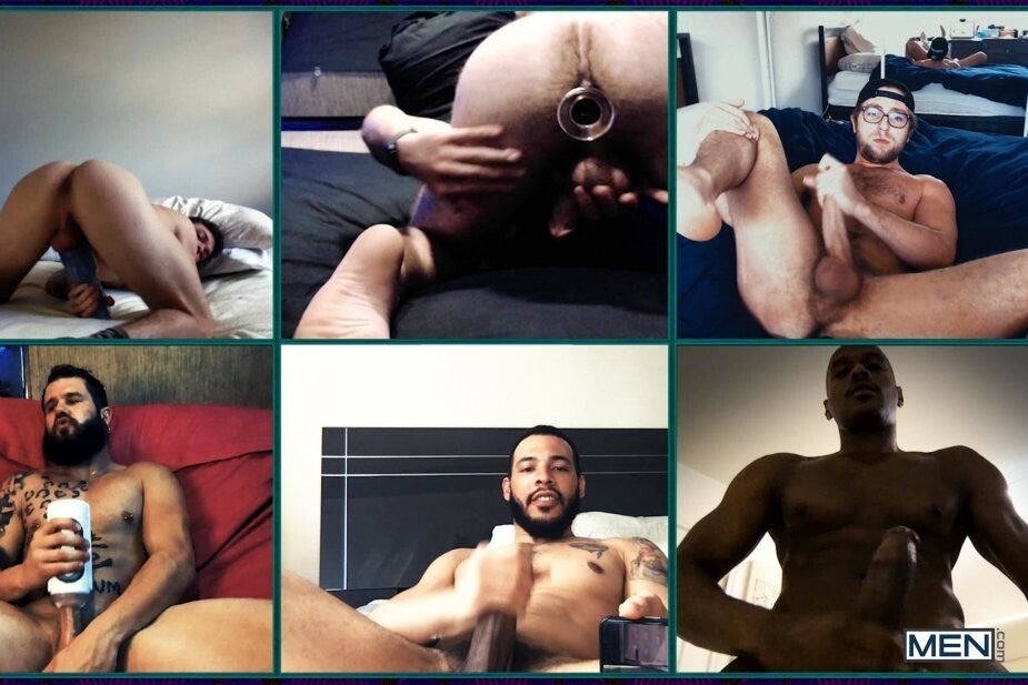 Group video calls aren't just for meetings anymore: six of Men.com's favorite studs put technology to good use for a virtual circle jerk as Luis Rubi, Dante Colle, Calvin Banks, Johnny Hill, Elijah Wilde, and Rhyheim Shabazz call in to get off. The guys catch up with some good-natured teasing and banter until Dante orders everyone who's still got pants on to get their dicks out ASAP! Calvin shows off his new molded dildo but, like Elijah and Rhyheim, he keeps things old-school by just using his hands. Dante penetrates his hole with his fave glass dildo, pretending it's Rhyheim's huge cock, while Johnny and Luis work their dicks with strokers. Luis twerks for everyone as he fucks his toy, slapping his ass by special request from Elijah, as the guys discuss whether they prefer to bottom or top, and who loves having their faces sat on. Dante can't wait any longer and cums, then cums a second time as Calvin and Luis both shoot. Rhyheim blows a big load, Johnny cums, and Elijah orgasms too to finish things off.