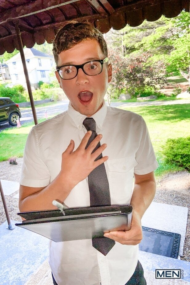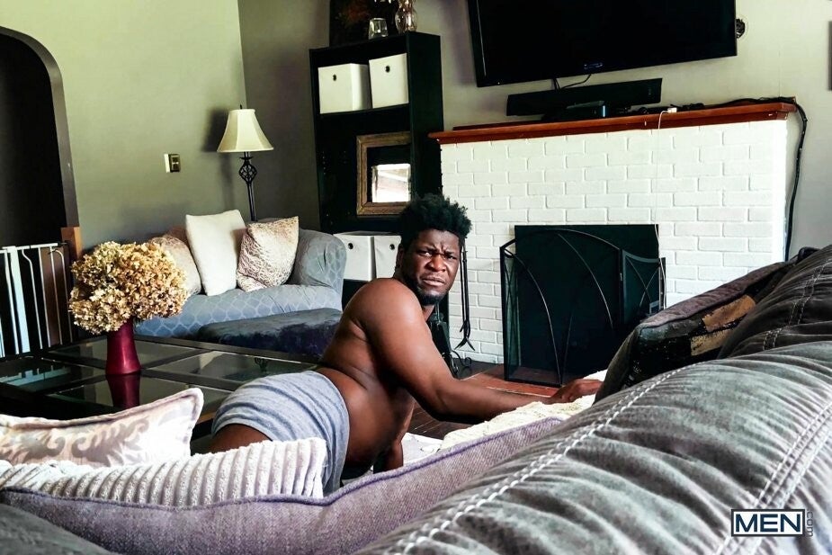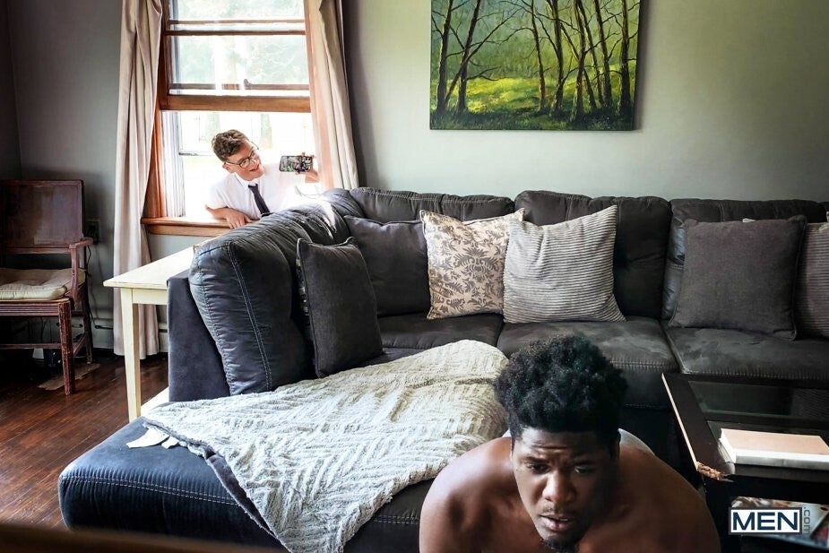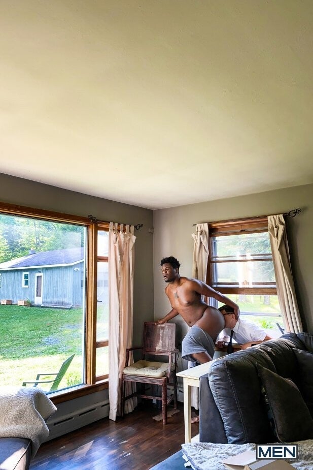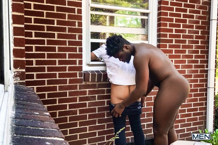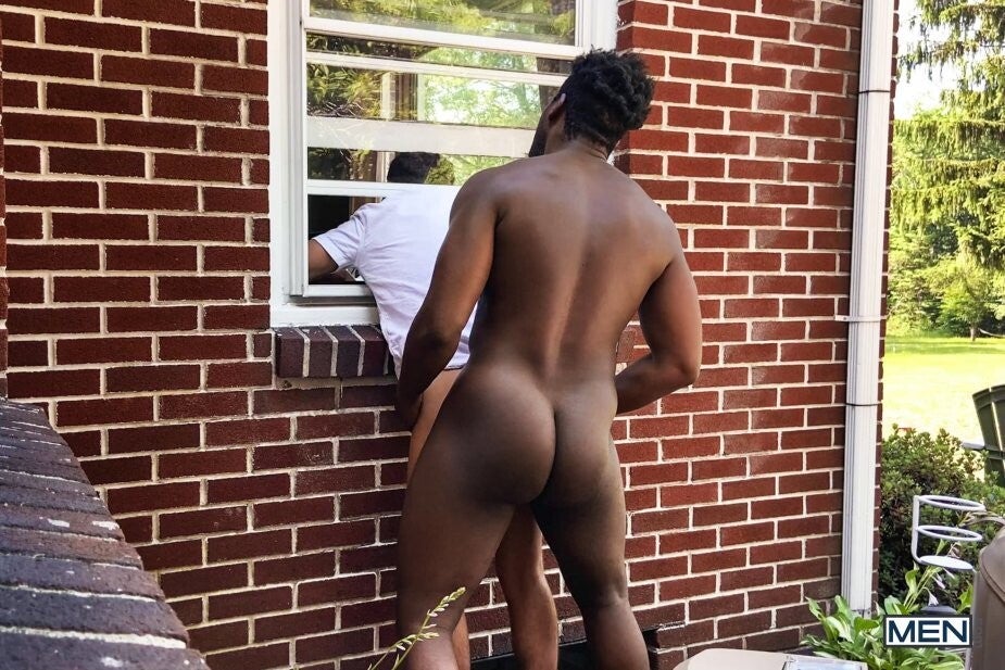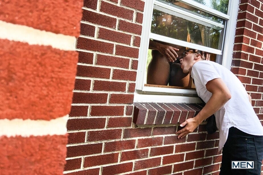Ty Shine isn't interested in the municipal meeting Bruno Cartella knocks on his door to tell him about, but Bruno is VERY interested in the sexy Black hunk! Bruno unprofessionally sneaks around the side of Ty's house and peeks in the window as the muscular top strips down to his briefs and does some calisthenics. But when Bruno gets his head and shoulders stuck through Ty's window, he's perfectly positioned for the horny top to stick his ass in Bruno's face before feeding him his cock. Ty comes outside to fuck Bruno doggystyle, only freeing the bottom from his predicament so Bruno can get on all fours and take his big cock even deeper before Ty cums all over the bottom's face!