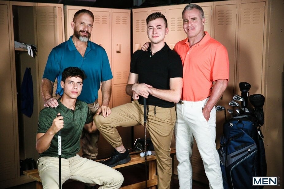 Working as a caddy has made Zander Lane realize just how much there is to learn about golf... and he hasn't learned any of it, since he's been too busy chasing daddies instead! For his and fellow caddy Kaleb Stryker's last day at the country club, they plan a foursome, hoping their sexy silver foxes will putt in their butts. The daddies undress their caddies and 69 before country club owner Dale Savage fucks Kaleb while avid golfer Dirk Caber fucks Zander doggystyle, then Dirk gets one caddy sitting on his dick and the other sitting on his face as Zander sucks Dale's dick. Dirk wants some of that daddy dick too, so Dale fucks him in missionary as Kaleb penetrates Zander. Once Dirk cums, both hot twinks jack their cocks till they cover Dale with their loads and Dirk fingers Dale's ass till he cums!