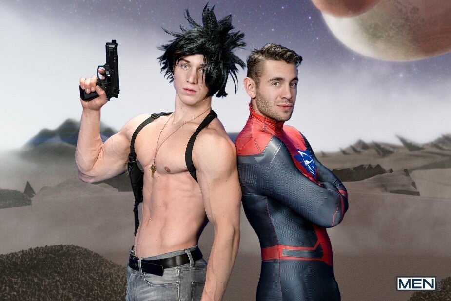 There are still some kinks to be ironed out of the new Anal Cumbat arcade game when con-goers Dante Colle and Felix Fox get sucked inside the virtual world. The gamers are shocked to find themselves dressed as the characters... and equipped with huge cocks! After defeating an enemy with their jizz weapon, the game world looks like it's cumming to an end, so Felix asks Dante to take him doggystyle. The guys start fucking and get transported back to the real world. They find an empty room at the con to continue their tryst, as Dante bends Felix over the table before they suck each other's cocks. Felix rides the top, then takes that dick deep in missionary. The security guard comes in to watch and decides to take a facial from both of them!