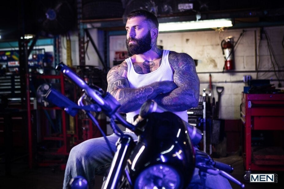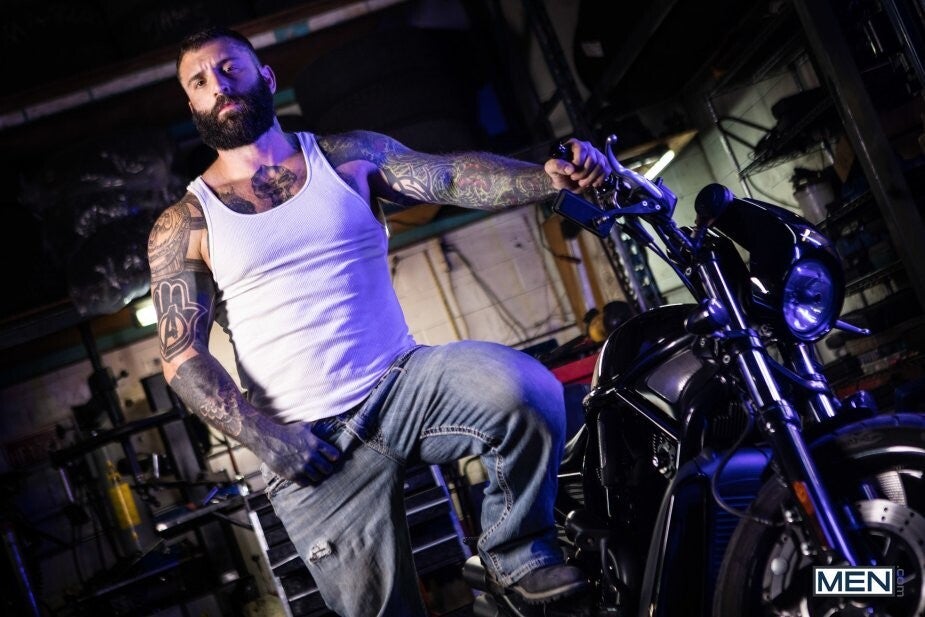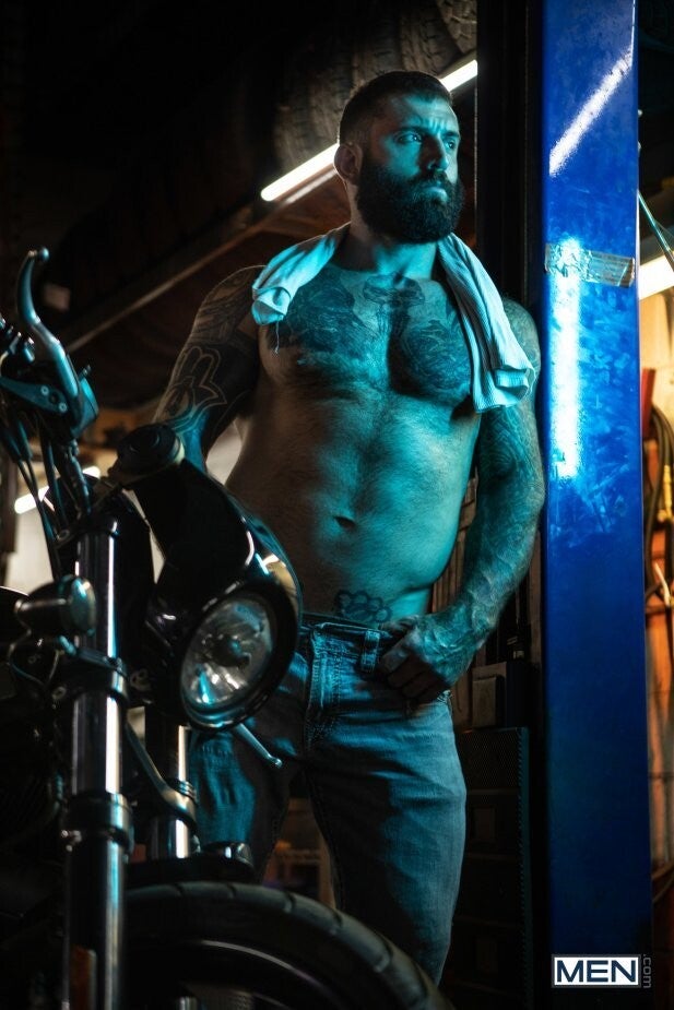 What would it be like to get with your favorite Men.com stars in the flesh? Now's your chance to find out. Tattooed stud Markus Kage is working on his bike in the garage when he pushes up his white undershirt to run his hands over his furry chest and abs, and grips his cock through his jeans. Manuel Skye watches from the door, stroking himself, as Markus strips down and slides his hard dick against the buttery leather of his motorcycle seat! Manuel kisses Markus's biceps and pecs, then sucks his cock before the top bends him over the bike and fucks him doggystyle. Manuel rides both of Markus's hogs as he takes that cock atop the bike, then lies back on the seat as the top pounds him mish, jacking his cock till he blows a big load. This bottom hungrily sucks Markus and swallows his cum!