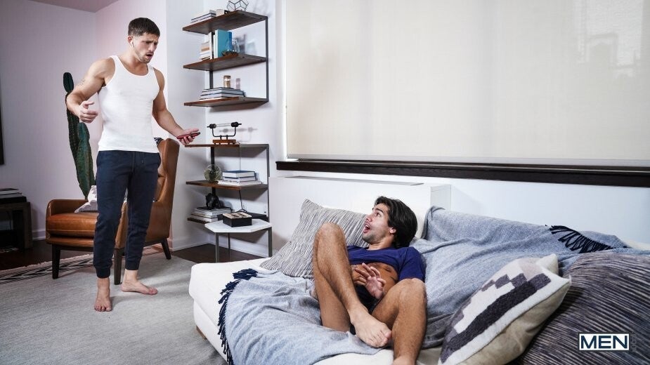 Ty Mitchell thinks he's home alone and the coast is clear, but his roommate Roman Todd walks in and catches him with his dick in his hand! Ty's been busting nuts left and right lately, so Roman decides to show him how to do it the right way. He lubes up his hand and starts stroking Ty's cock, then has the tattooed hunk lie back against him and puts his headphones in Ty's ears to set the mood as he caresses his chest and jacks him off. The guys start kissing and before long Ty is sucking Roman's cock before he rides it! Roman bends the bottom over to fuck him doggystyle, then penetrates him from behind in spoon. Ty moans loudly as Roman pounds him missionary while the top handles his dick the right way, and he shoots a huge load before Roman pulls out and cums on his hole.