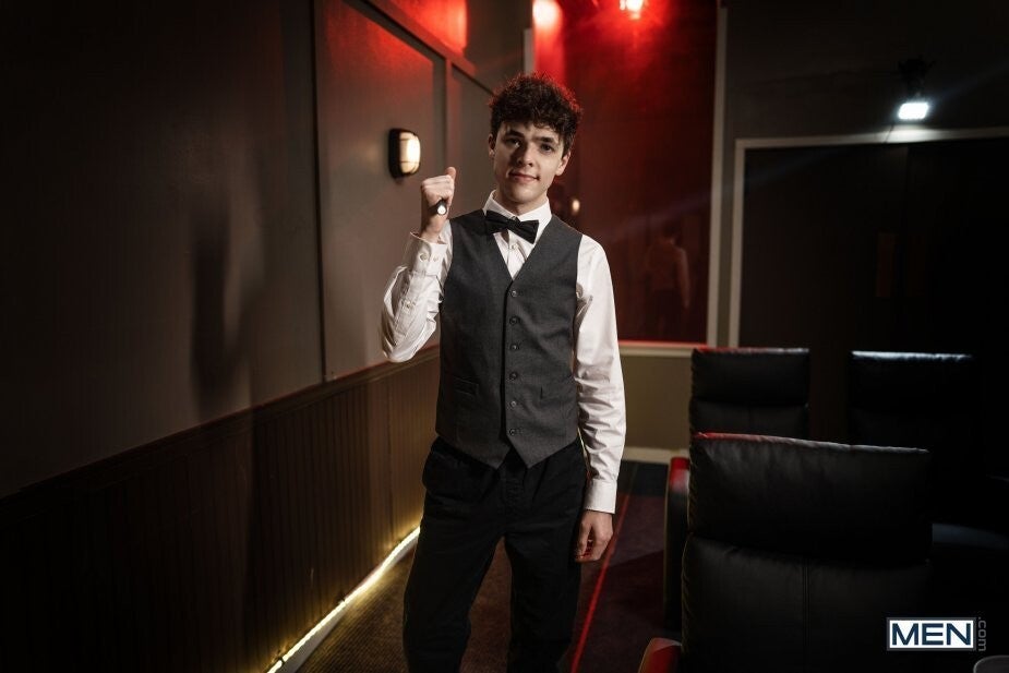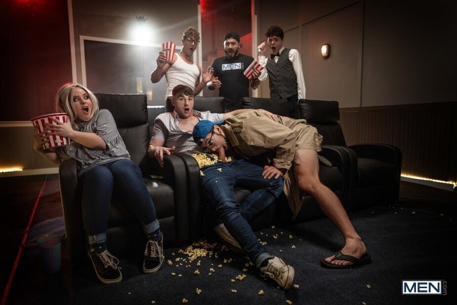 Flasher Dante Colle sits down near Michael Boston and his girlfriend in the movie theater and doesn't even try to hide that he's jacking his cock under his coat... and Michael's into it! Once the lights go down, so does Dante, sneaking over to suck Michael's cock. His girlfriend notices and storms out, and the horny guys are caught by twink usher Troye Dean, who's soon persuaded to join them. The guys suck each other, and Michael and Troye take turns riding Dante before Troye and Dante spit-roast Michael. Then it's the twink's turn to get his hole filled missionary on the floor by Michael till he orgasms, and Dante fucks his face! Michael and Dante bend Troye over between the seats and take turns pounding him till they cum all over his ass.