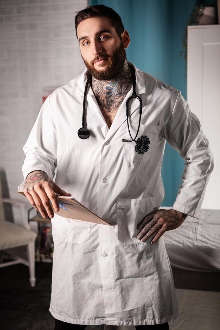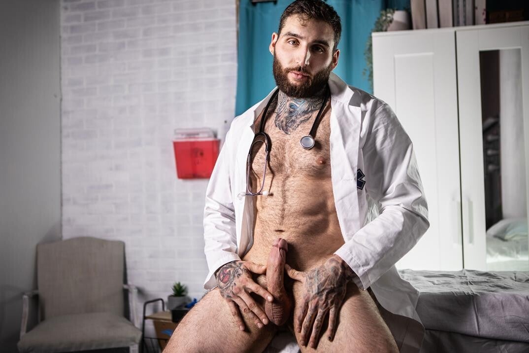 Dr. Tony D'Angelo is peeking through the gloryhole he found, watching the nurses fucking in the next room, when his next patient, Dane Jaxson, comes in and catches him with a stiffy! Tony decides to skip straight to the prostate exam, and Dane moans as the sexy doctor fingers his hole, telling him to go even deeper. Tony is happy to oblige, fucking Dane in missionary and even using the ultrasound so he can see his cock moving in and out of him! Tony does an oral exam, penetrating Dane's mouth, then fucks him doggystyle. The bottom rides the doc, stroking himself till he cums, then takes an injection of jizz in his hole!