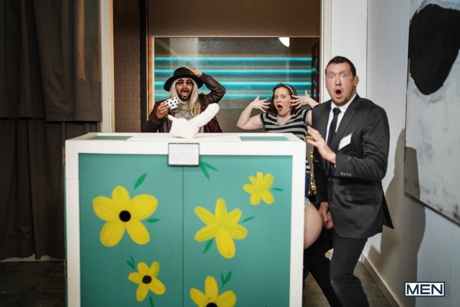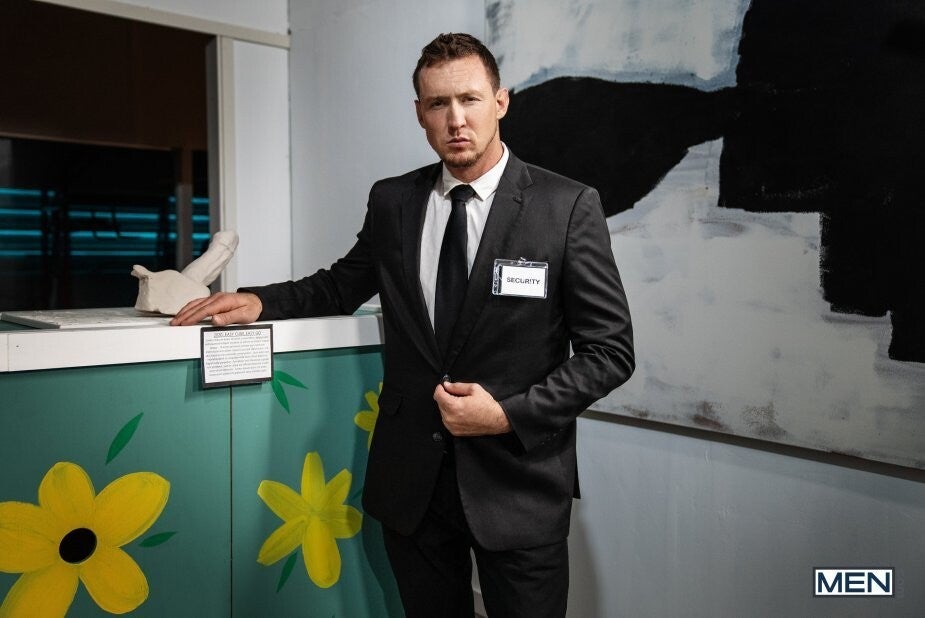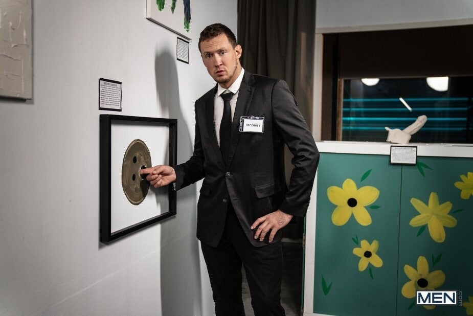 Paul Canon might rather have stayed home to watch the game than come to an art gallery with his girlfriend, but he has a surprisingly profound appreciation for abstract art... especially when security guard Pierce Paris hides inside the pieces and puts his mouth through the glory holes! After a sneaky blowjob, Pierce pokes his cock through another hole for Paul to stroke, and then it's Paul's turn to get into the art and put his ass against the hole so Pierce can fuck it. Pierce rims the bottom and Paul rides him on a bench, then gets fucked doggystyle and missionary. After Pierce pulls out to orgasm, Paul uses the top's jizz as lube as he strokes himself and makes some Jackson Pollock-style art of his own!
