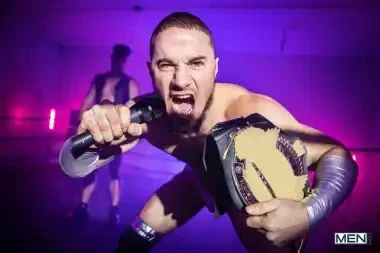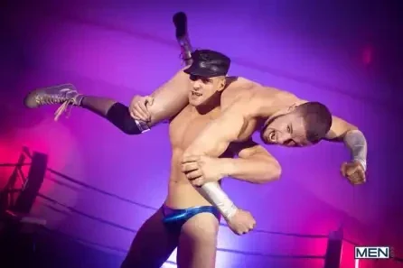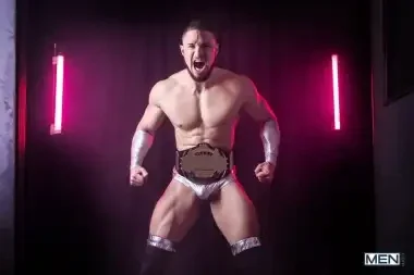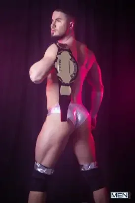 Two weeks ago, Malik Delgaty and Skyy Knox faced off in the ring, and heel Skyy cock-slapped Malik across the face and took the belt! Today at Asshole Mania, Malik is ready for his revenge. The wrestlers enter the arena to cheers and jeers, and Malik quickly shows that this time, he's going to be the one dominating. Skyy tries to regain the advantage by squeezing Malik's balls, but it has no effect! To the bearded villain's disbelief, the muscular top effortlessly pushes Skyy to his knees and fucks his face. Malik even picks Skyy up for an upside-down blowjob before bending him over the ropes and fucking him doggystyle. But Skyy won't let the upstart face take his title that easily, tossing Malik to the mat and riding his cock! Malik counters with a piledriver, then cements his victory by pounding the heel in missionary till Skyy cums, then giving him a facial!