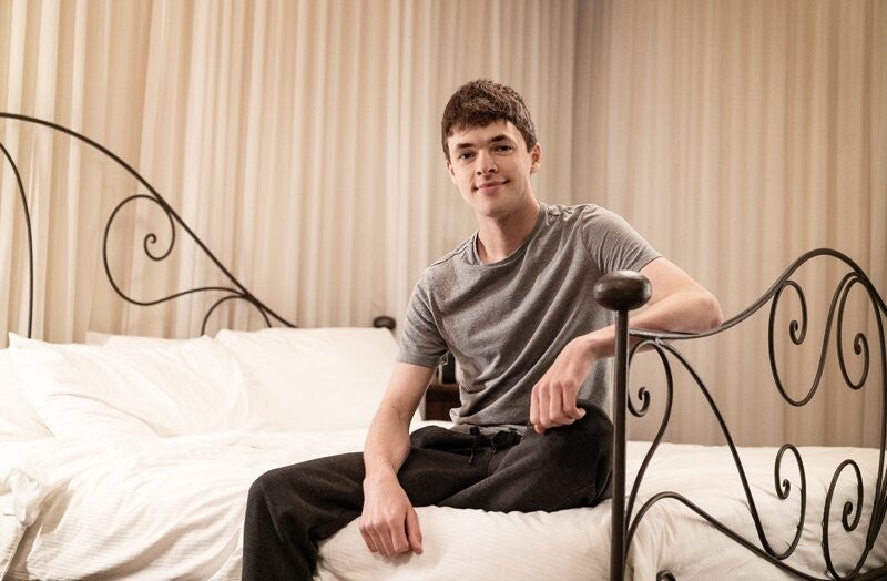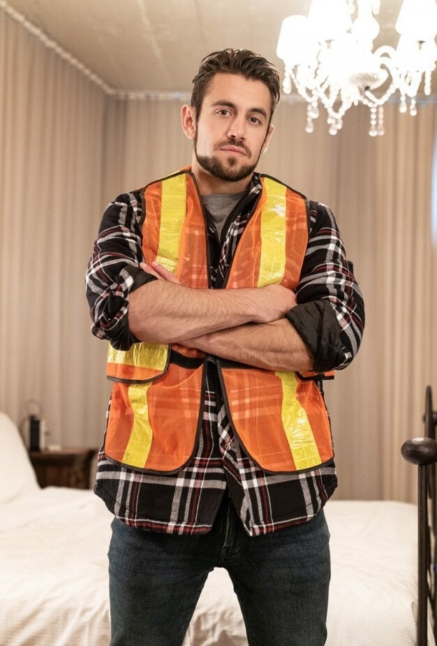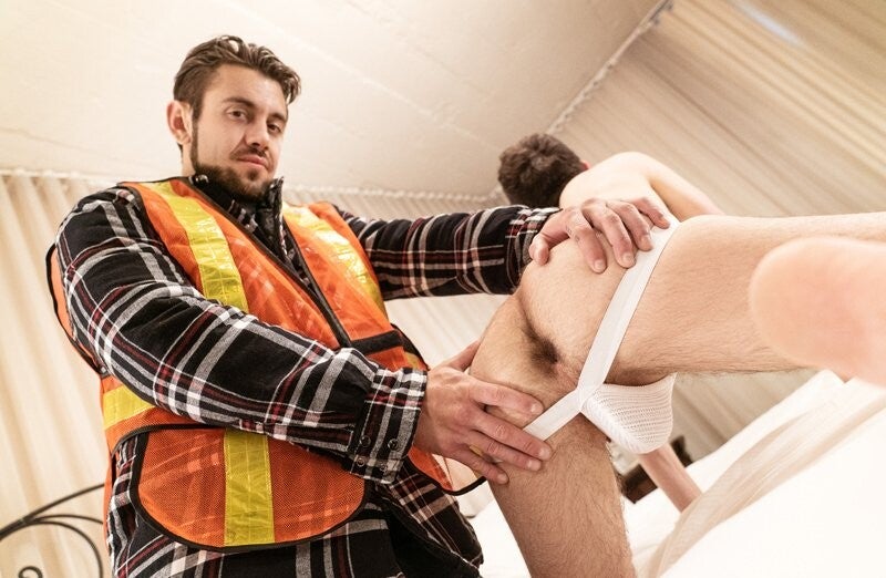 Troye Dean needs to get topped hard. He texts his hookup, telling the dom he'll wait for him ass up in bed, and proceeds to do just that. Troye obediently doesn't turn around as bearded construction worker Dante Colle lets himself in. Dante notices the bottom's hole waiting for him and enters the bedroom to use it, undressing and penetrating Troye... and that's when the twink realizes Dante isn't the neighbor he scheduled for his dick appointment! Dante came to the wrong address, but Troye says that since he's here, he may as well finish the job. The top pounds Troye in doggystyle before they 69, and the twink rides him reverse before taking a deep drilling in missionary till he orgasms, then takes a facial.