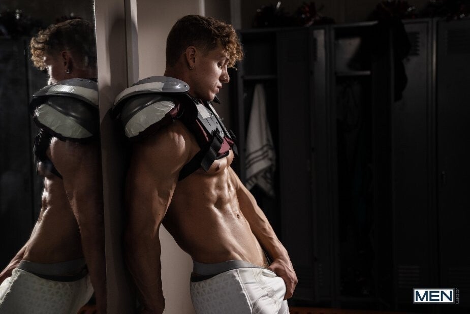 Reporter Adrian Hart gets a bit distracted during his post-game interview with winning QB Felix Fox when the sweaty athlete strips down to nothing but a towel, so he takes a little break to suck Felix's cock! Felix is all about staying humble, so he's not above doing his part to make Adrian feel good, tonguing his hole and sucking his dick before he penetrates Adrian doggystyle. Adrian rides the hot football star, then Felix fucks him missionary on a bench till the bottom cums. Felix celebrates his victory with a huge load on Adrian's abs!