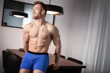 Olivier Robert and his BF have invited over some friends for a fancy brunch, but Olivier wants to get a taste of his guest! When he lets Malik Delgaty in, he sucks his fingers, then starts rubbing Malik's cock under the table. When Malik sees Olivier's booty bent over in front of the fridge, he is too tempted and has to sink his cock inside! They get caught by the other guest, but Malik sends him packing as Olivier lies back on the counter with his legs spread to take the top's cock! Olivier sucks Malik and rims him before bending over the counter for more hard drilling, then rides Malik on the floor. Olivier may have dropped the cake on the floor, but luckily Malik gave him a creampie!