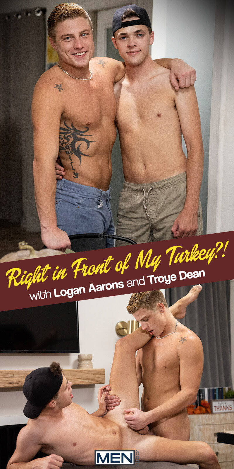 When the TV signal goes out during the big game, Troye tries to fix the TV, and since his ass is already nearly out, what's Logan Aarons to do but fuck it? Logan jizzes in a foam finger just as Troye fixes the TV and their buddy comes back from the kitchen, so they hide under a blanket for some sneaky cock-stroking. When the hostess carries the beautiful golden turkey out and calls them to the table, Logan can't help himself: he jizzes all over Troye's face... and their dinner! At least now the horny guys are free to devour each other's dicks and fuck on the couch before Troye rides the top till he cums, and takes a facial.