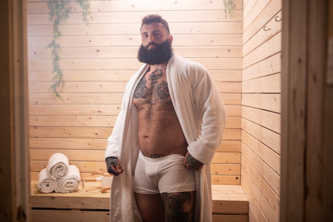 As twink Ryan Bailey gets steamy in the sauna, tattooed top Markus Kage enters. He pours a dipper of water over his chest and down his white briefs, turning them see-through to give Ryan a look at his thick cock. Markus lets the bottom know he can do more than look, and soon Ryan is on his knees sucking that big dick. The top pounds his hole in doggystyle, and Ryan rides him, then cums as Markus penetrates him on his back on the bench. The top finishes his steam with a load on Ryan's face!