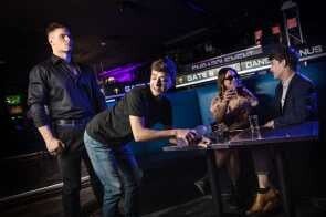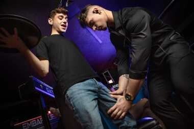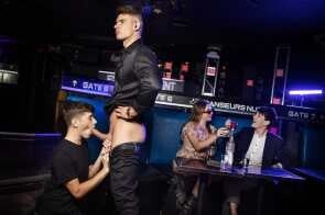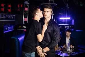 When his client goes to a club for a night out, dedicated bodyguard Malik Delgaty assesses all possible threats, including giving cocktail waiter Joey Mills a very thorough pat-down. The twink enjoys it so much, he does whatever it takes to get Malik's attention again, pulling down the stud's pants and sucking his cock! The head is so good, Malik neglects his duties to pick the bottom up for an upside-down bj, then fingers his hole and fucks him doggystyle. Joey rides the top, then cums as Malik pounds him on a table before taking the muscular hunk's load on his face.