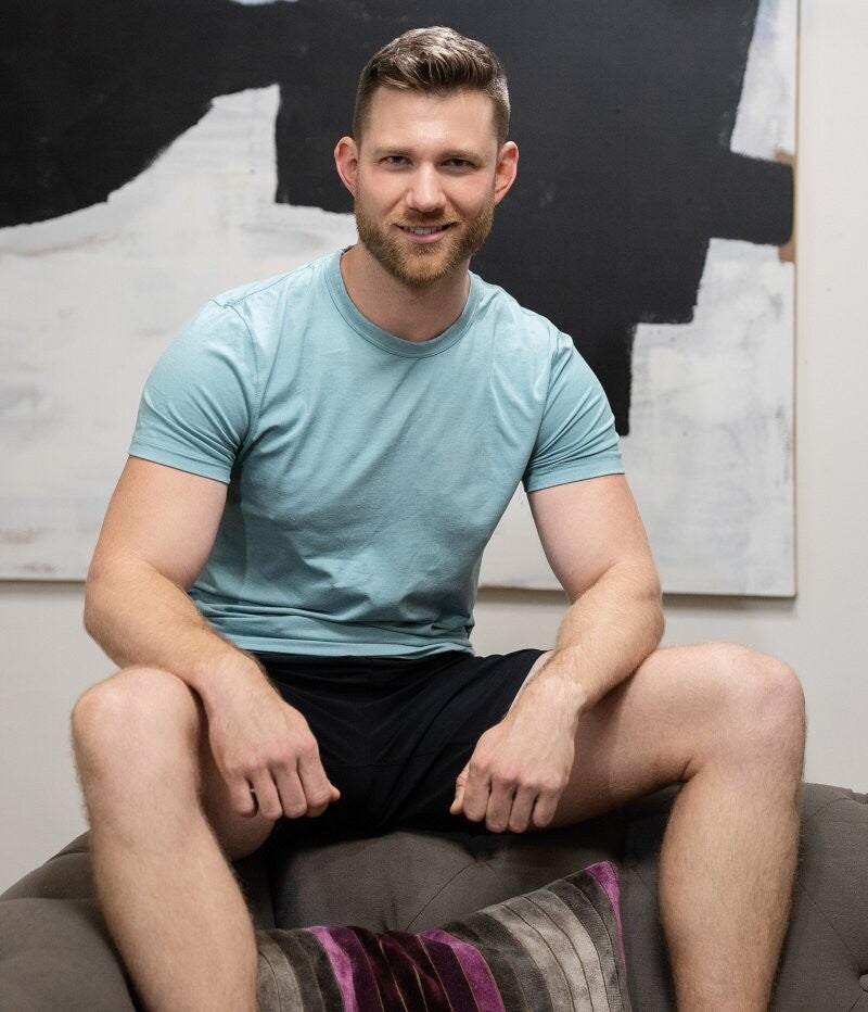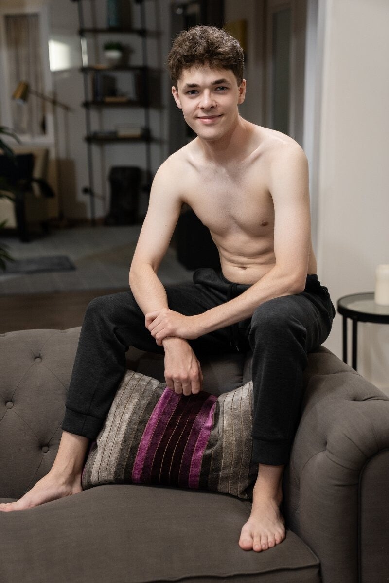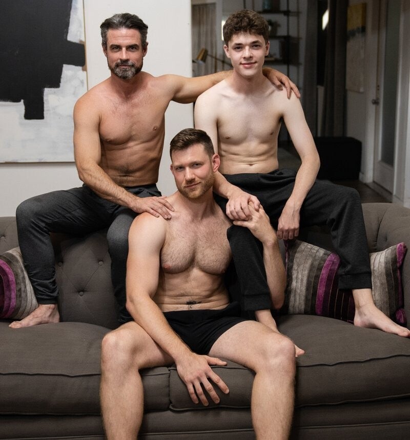 Caden Jackson notices something's up when their supposedly straight host Daniel LeBang hand-feeds his boyfriend Troye Dean, and he peeks under the table to see Troye giving Daniel a foot job! Caden crawls under to suck Troye's cock and get fucked by Daniel, right in front of the third member of their throuple! When their other boyfriend and Daniel's girlfriend see what's going on, it looks like this might be the start of a new throuple as Daniel and Troye take turns using Caden's mouth and his hole. Troye and Caden swap cum, then silver fox Daniel blows his load on both their faces!