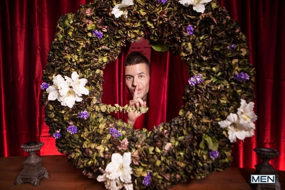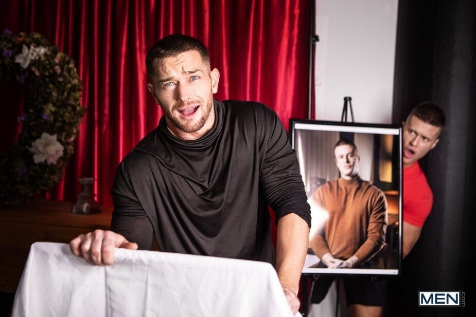 There are many sad mourners at Clark Delgaty's funeral, especially his boyfriend Johnny Donovan and his best friend Theo Brady... which makes the very much alive Clark happy as he sneakily watches behind the curtain! Clark is shocked when he overhears that Theo fucked his boyfriend yesterday, then has a view of Theo sneakily sucking Johnny's cock behind the podium during his speech. Clark bursts out and admits to faking his own death, and Johnny suggests they all celebrate that Clark is still alive with a threesome. The guys start kissing as they undress each other, then Theo does a handstand on the couch as Johnny sucks him and Clark plays with his hole.