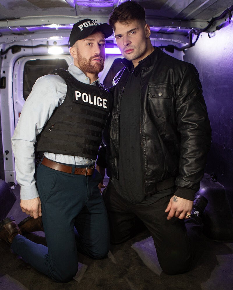 When the exchange goes sideways, new enforcer Malik Delgaty knows he needs to find the police surveillance van and do whatever it takes to get the evidence. In the van, officer Olivier Robert is so distracted watching the feed of the gangster fucking the undercover cop--and jacking off--he doesn't spot Malik approaching till he busts open the doors. Malik decides if his boss can fuck a cop, so can he, and takes out his cock for Olivier to suck. He pounds him in doggystyle, then the bearded officer rides him before taking it deep in spoon position till he cums. Olivier takes a facial so good it's criminal... and that's not all.