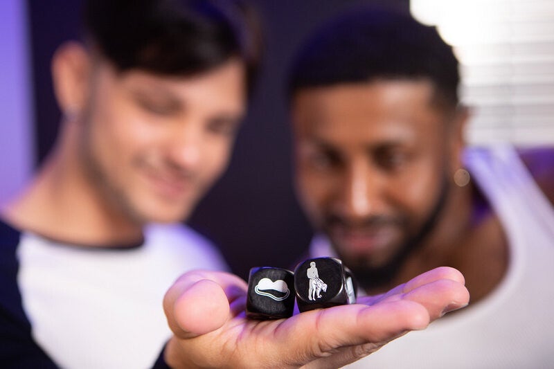 His roommate Enzo Muller finds his sex dice, and Braxton Cruz gets a little flustered but agrees to show Enzo how they work. After Enzo rolls to put on a blindfold, Braxton shakes his dick in the bottom's face, then gets a blindfolded blowjob! When Enzo realizes Braxton actually rolled to 69, he scolds the top to play fair, and they strip down so Braxton can lick his hole as Enzo sucks him. Enzo rolls riding and eagerly climbs on top, and on Braxton's next turn it's time for doggystyle. The guys follow the dice's instructions until Braxton pounds Enzo in missionary and they both jack off and cum!