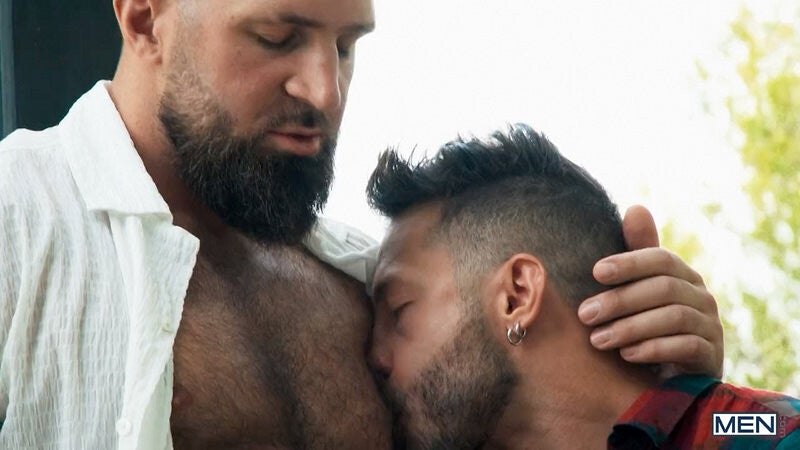 Chuck Conrad is enjoying the sun and fresh air on the balcony so much, he unbuttons his shirt to feel it against his skin. John Brachalli joins the tall, muscular top and helps him feel even better, touching his chest and then nuzzling his bulge through his shorts. Chuck fucks the bottom's face, then they head inside where John rides him in a rocking chair. Chuck bends the bottom over against the stairs, then carries him, still fucking him, up to the landing where he slaps his ass as he drills his hole. John cums as he gets railed from behind against the railing, then sucks out the top's load.