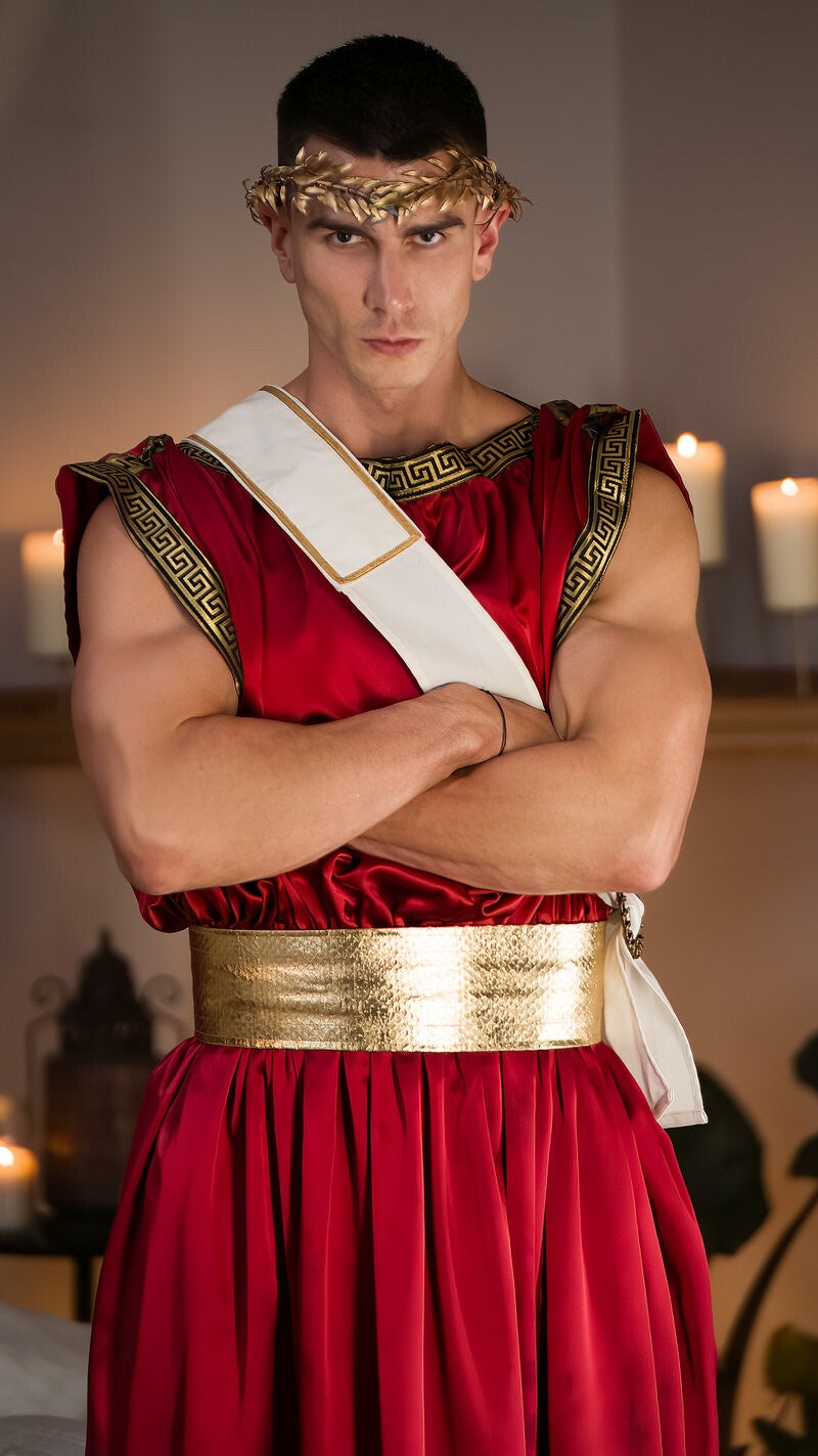 Caesar (MrDeepVoice) thought he would be bathed in glory after the gladiatorial bout, but his champion (Dom King) and the Gallic warrior (Filou Fitt) won it all! The emperor hurriedly meets with Senators Cassius and Brutus to determine how to best turn the situation to his advantage. He has the imprisoned gladiators brought to him, and both kneel and kiss his ring. The horny emperor proposes sealing their alliance with an orgy, and instructs his guard (Malik Delgaty) to undress the warriors, and himself as well! The guard joins in to spit-roast the emperor, and all three burly fighters enjoy the imperial ring. Caesar bathes in the seed of both gladiators, but he's about to get a different welcome from the Senate than he expects. Et tu, Brute?
