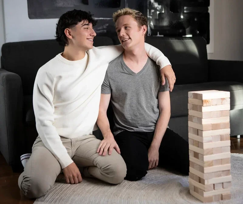 Twink Benny Fox is super bored playing a block stacking game with his pal, so Callum West proposes a way to keep it interesting: adding a strip penalty! Benny knocks over four blocks, so removes four pieces of clothing, turning Callum on. When Callum pokes his dick through the hole he just poked a block out of, Benny demands the top fuck him, and starts sucking. Callum puts Benny on his back and drills his hole, then fucks him on the floor in doggystyle. Benny rides the top, then cums as Callum pounds him from behind. The Aussie twink gets to his knees to swallow Callum's load!