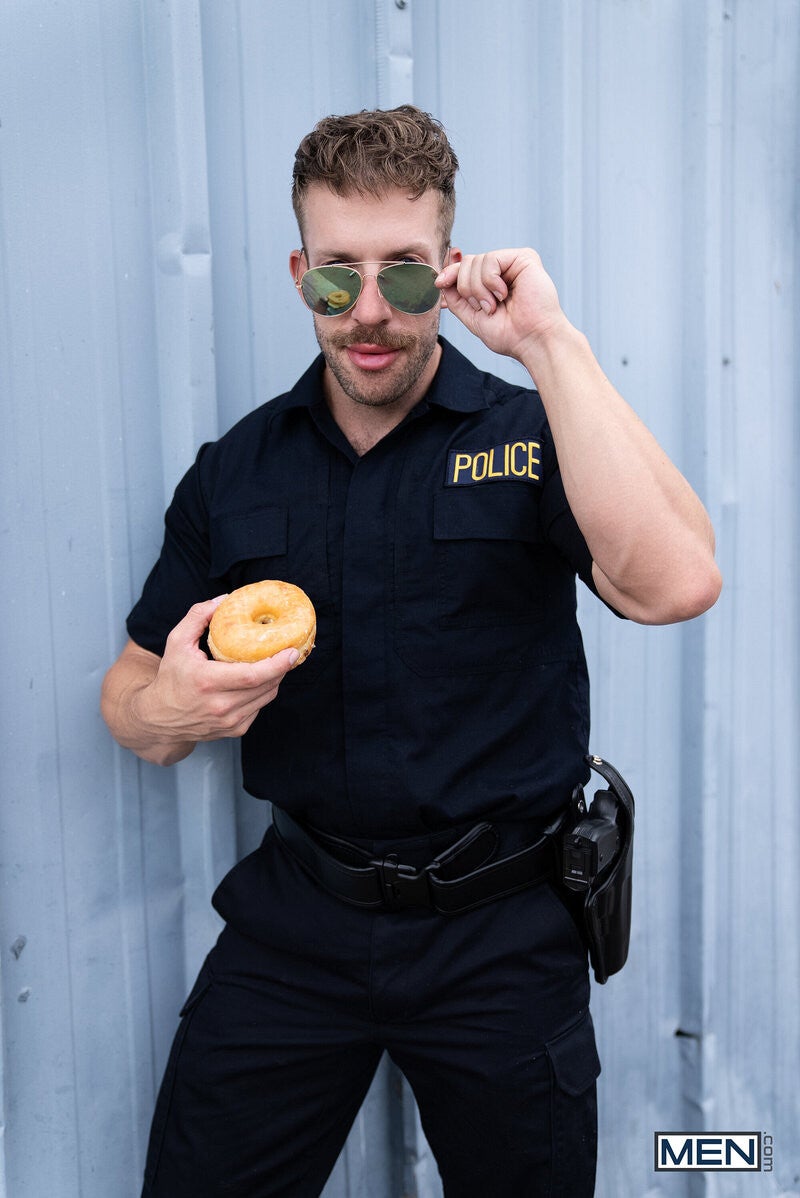 Damian Night is chasing down the villain who pickpocketed him when he runs right into hot police officer Morgxn Thicke. Morgxn takes Damian to the precinct to fill out a report, and gets a very thorough description of the perp, especially his bulge. Damian checks out the officer's bulge for comparison, and the guys suck each other, then Morgxn rims Damian and pounds him on his desk. Damian forgets all about his missing wallet when Officer Thicke is giving him the best dick, and he takes it doggystyle and on his back, then rides the top till he cums all over him and begs the cop to shoot all over his face.