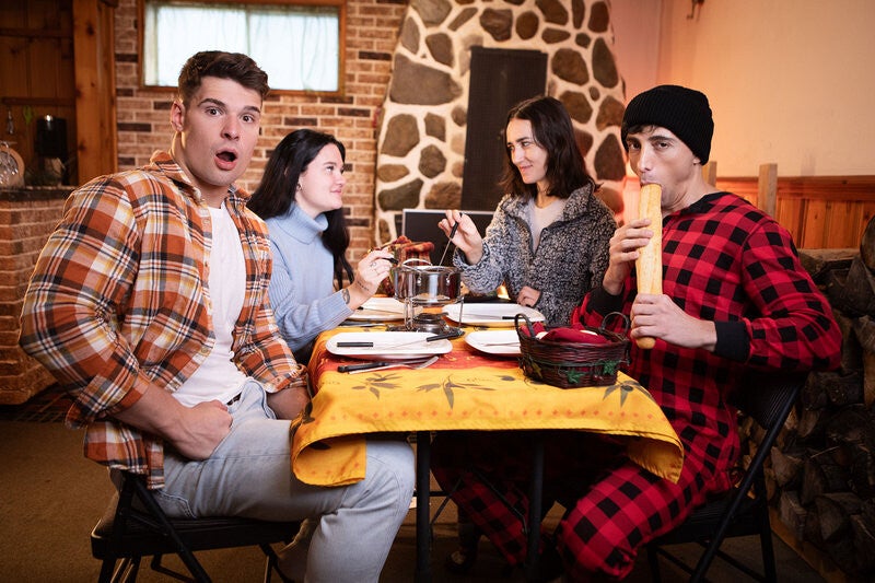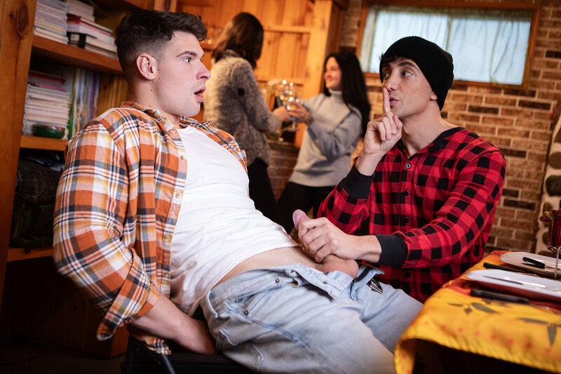 After a long day in the winter wilderness with their girlfriends, Liam Alyesto gets more than just warmed up as he watches Malik Delgaty take off his coat. Liam opens the butt flap in his onesie and flashes Malik his ass, and when they sit down for some fondue he shows the muscular hunk just what he has in mind on the big baguette, stroking it suggestively and sucking the end. While the women are in the kitchen, Liam gives Malik a hand job under the table, then slips off to the bedroom. Malik follows, finding Liam waiting on the bed on his hands and knees, ass out. Malik gives the bottom what he wants, penetrating that hole. Liam sucks Malik, then the guys fuck in spoon position before he rides the top. Liam cums as Malik drills him on his back before taking a delicious, drippy load on his face.