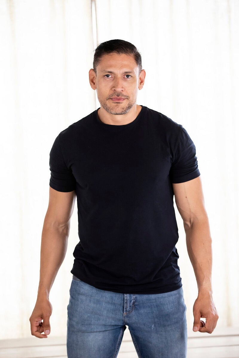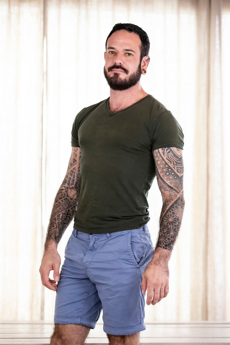 John Rodriguez is relaxing in the hammock when tattooed, bearded Tex Pat joins him and lets the top know he's horny! The guys head inside but don't make it past the dining room as they undress each other and Tex sucks John, who puts him on the table to lick and fuck his hole. John drills the bottom in doggystyle and missionary until they both cum.