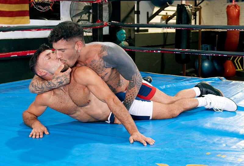 Wrestlers Alex Ink and Jolian are ready for their match, and when the referee blows his whistle, it's on to see who will be first to pin the other! After some jockeying for position, it's Alex who gets Jolian face-down on the mat, but his finger against the opponent's hole is against the rules. Alex grinds against Jolian's ass, and the guys are so into it, they don't even stop when the ref calls the match! Jolian sucks the top, and Alex teases his hole with his fingers and tongue before sliding his cock inside. Jolian gets on top as he rides Alex, who puts him in a headlock while the bottom sucks him, then pins Jolian again for a 69. Jolian rides him till he cums, then takes a facial from the champ!