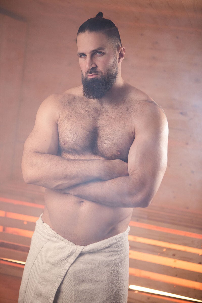 Chuck Conrad's girlfriend isn't pleased when she sees him checking out Michael Vente's ass in the sauna. As she relaxes with her eyes covered, Chuck spanks the stranger with the birch twigs, but she's annoyed by the noise. Michael decides to quietly suck the muscular hunk instead! Chuck's GF catches them and storms out, leaving the sweaty guys free to keep playing. Chuck fucks the bottom against the wall, then Michael rides his big dick on the bench. Chuck drills Michael till the bottom orgasms, then adds to his sweaty wet face with his load.