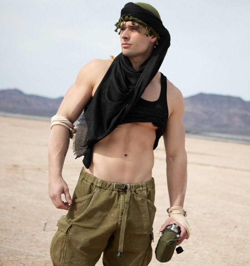 In a post-apocalyptic wasteland, Malik Delgaty wanders the once-verdant desert searching for something more precious than gold: water. After drinking the last dregs from his canteen, he sees a tent and drags himself closer. Inside, Austin Wolf and Damian Night have water, but no food, but Damian wants the precious source of calories in Austin's balls! Malik watches, touching himself, as Damian sucks the top's cock. Austin rims him, then fucks the bottom doggystyle. The secret watcher jacks his dick as he watches the submissive bottom ride the top and get fucked till both orgasm, but as Malik is plotting how he can get his hands on some of their water, he gets a surprise...