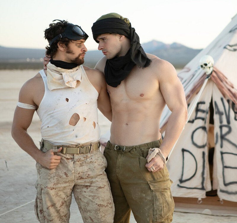 With his canteen filled enough for a few days, Malik Delgaty sets out across the desert alone and on foot, with instructions to run if he sees any of warlord Roman's men. But when he's chased down by two goons on wheels, Malik is cornered and captured! Shamu Azizam and his partner bring Malik back to their tent, and the charismatic wanderer soon talks his way into Shamu's bed... and his hole! He fucks the warrior in spoon, then doggystyle, even drilling him in piledriver. Shamu sucks Malik, then begs for his cock in his hole and cums as he gets fucked on his back. Malik shoots his load on Shamu's face, but will this new ally be permanent or only temporary?
