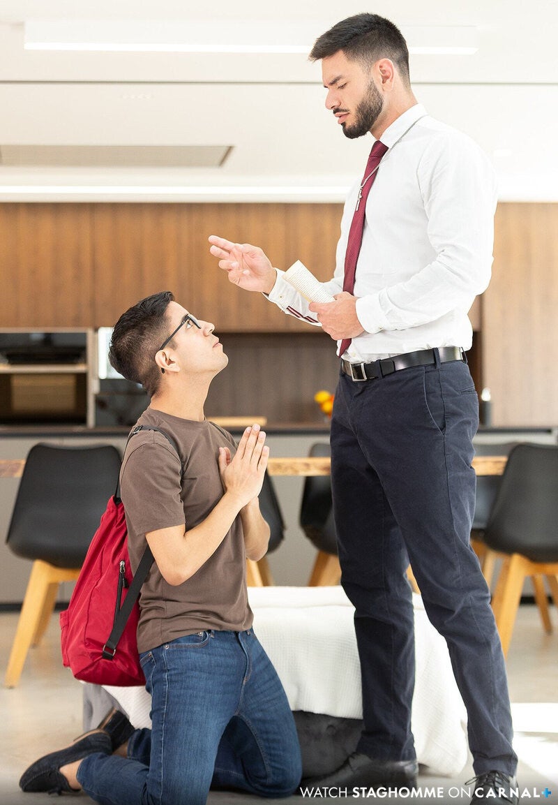 He stopped to let me breathe, kissed me hard, and then spit into my mouth, something that I’ve rarely experienced before. It was then that I knew I was in for a hard ride. This was no holy man, despite the crucifix around his neck. He took control of my body, using me to satisfy his burning desires like a sex toy; alternately pounding his cock into both of my holes until I could hardly stand it, smothering my cries of pleasure/pain with his strong hand. I was on my back with my hips in his firm grasp when he finally had his fill of me and he bred my ass deep with his seed. Then he plunged his fingers into my bruised and battered hole, digging his cum back out, and feeding it to me as if in some perverse act of communion, in which I willingly partook.