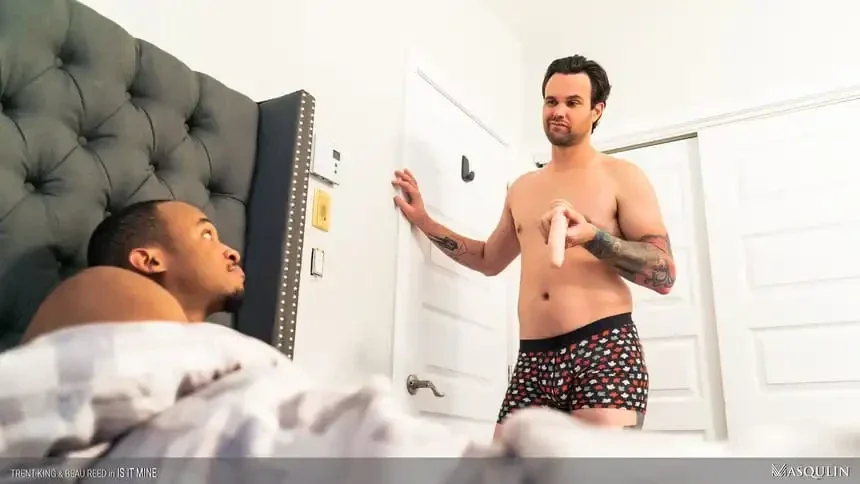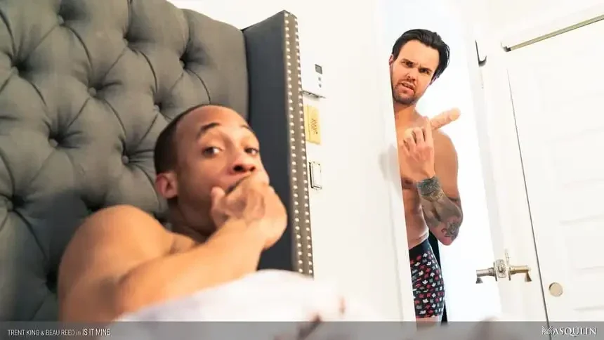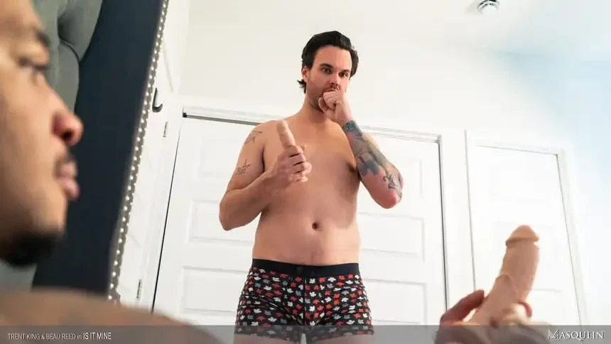 When Beau Reed finds the realistic penetrating length-sized dildo he received as a secret Christmas gift in his roommate Trent King's nightstand - he wonders if Trent found it and has been using the veiny shafted sex toy. But, nope! Beau's anal toy is where he left it. That night, when Beau hears his roommate riding his own dildo, he visits Trent's room and lets him know "I know what you are doing". Why play alone when you can play together? And, while their sex toys are realistic enough - they can't beat the real thing!